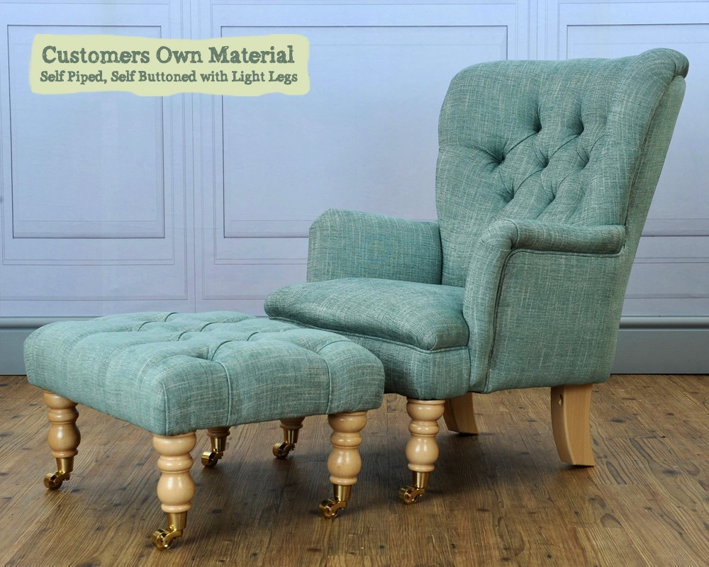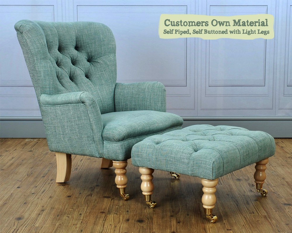 The Nairn is a pretty little chair with a deep buttoned back and optional matching footstool with a turned castor leg.