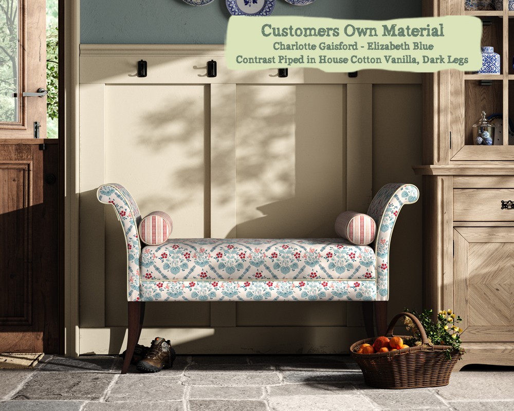 If you are adding on bolster cushions, we require an extra 1.5 metres (plus 1 vertical repeat) of your fabric, and if opting for contrast piping on the bolsters we need 0.5 metres of fabric.