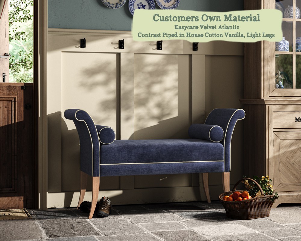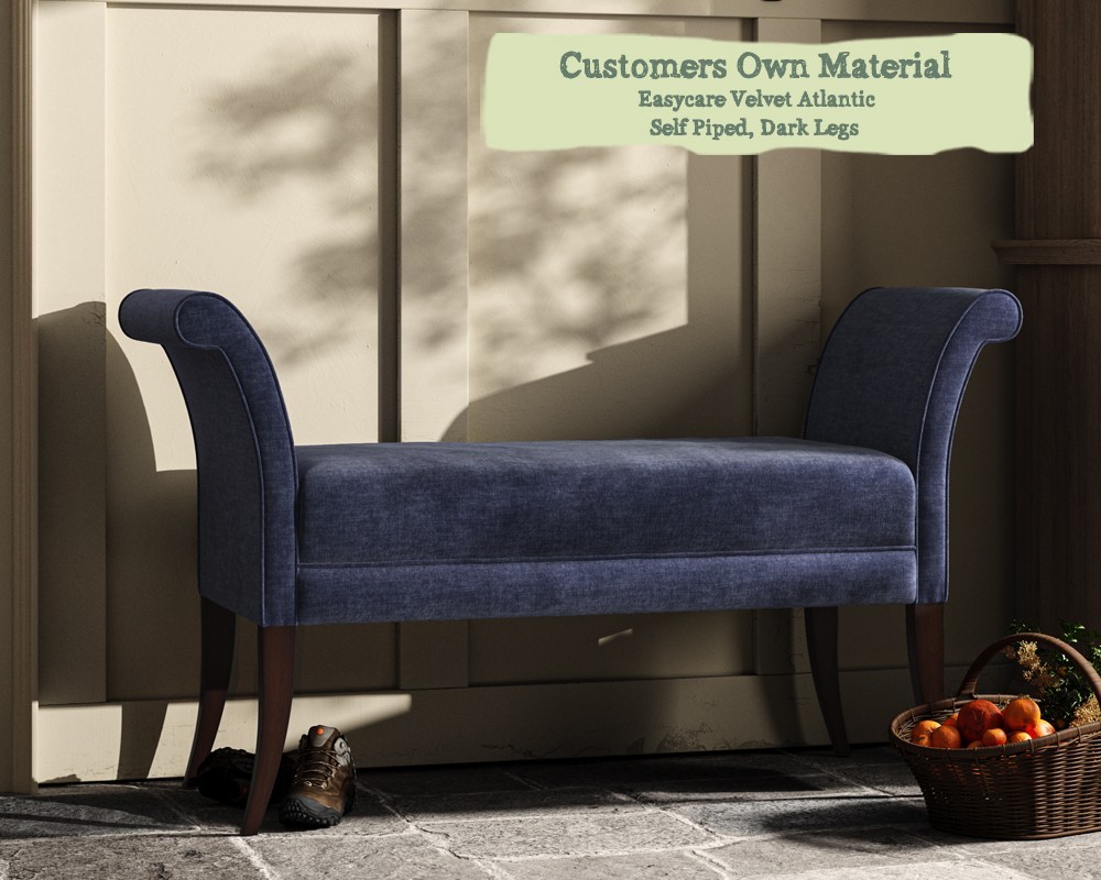 The Broxbourne Bench Stool is ideal for entrance hallways, nooks, boot rooms and as an upholstered end of bed bench. Its beautifully proportioned seat pad and scroll arms are complimented by curved beech wood legs.