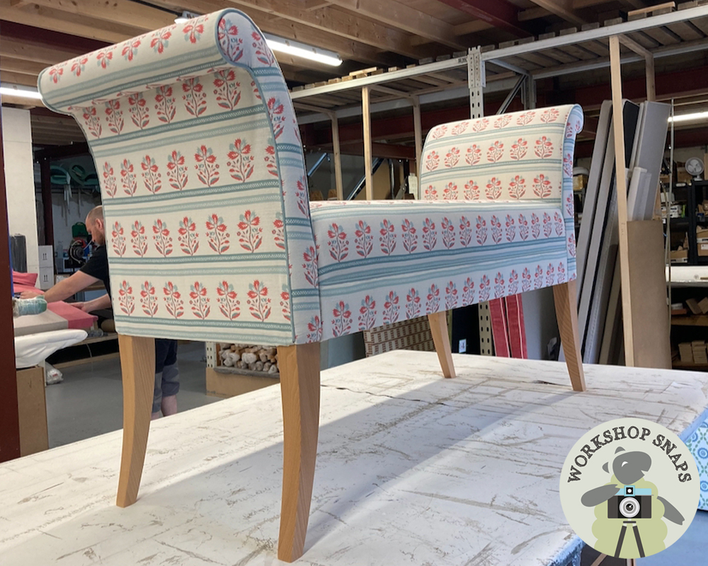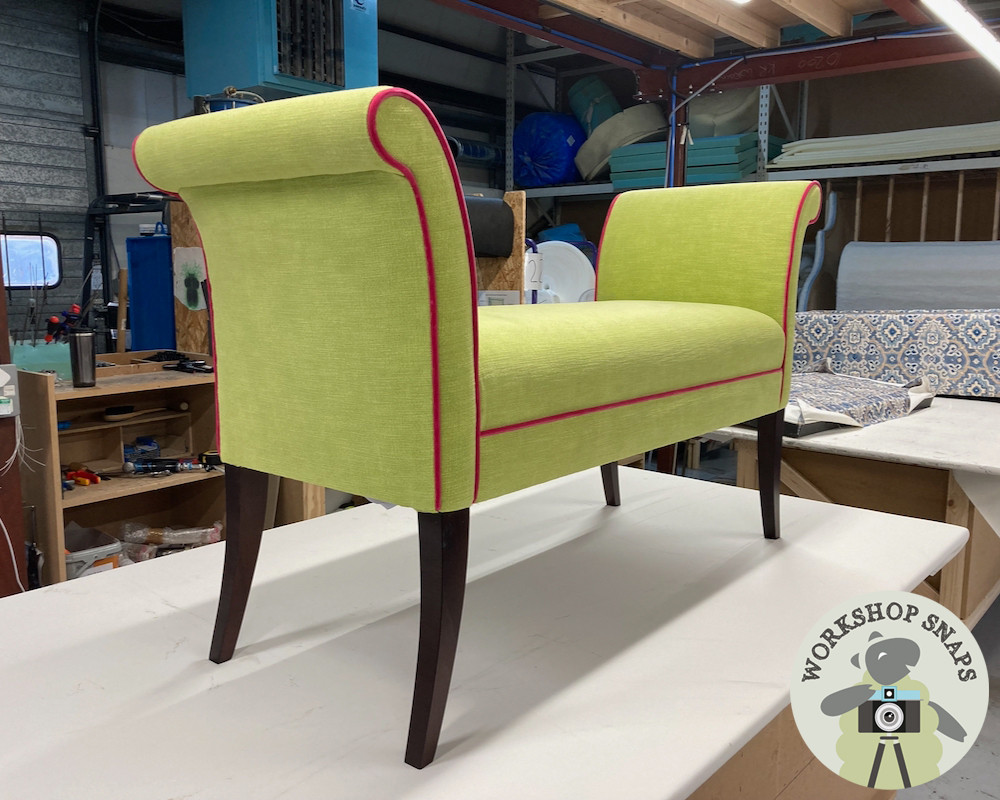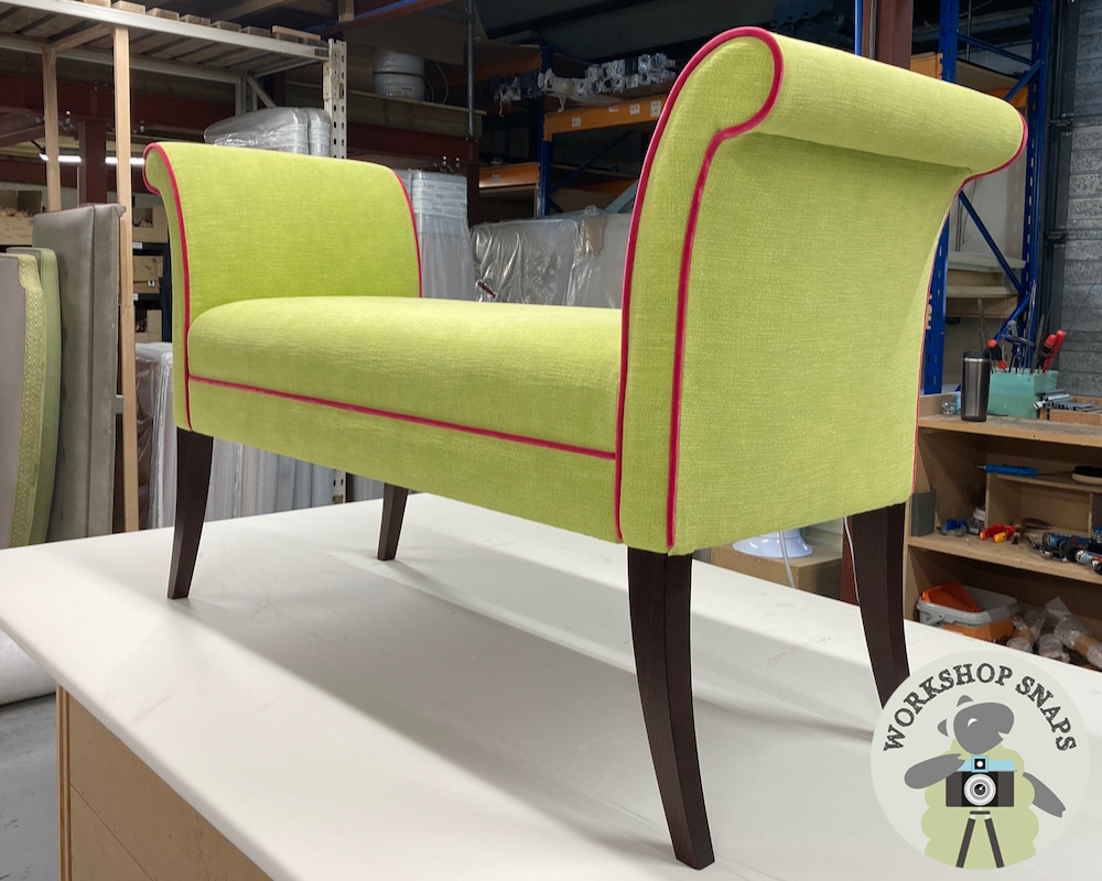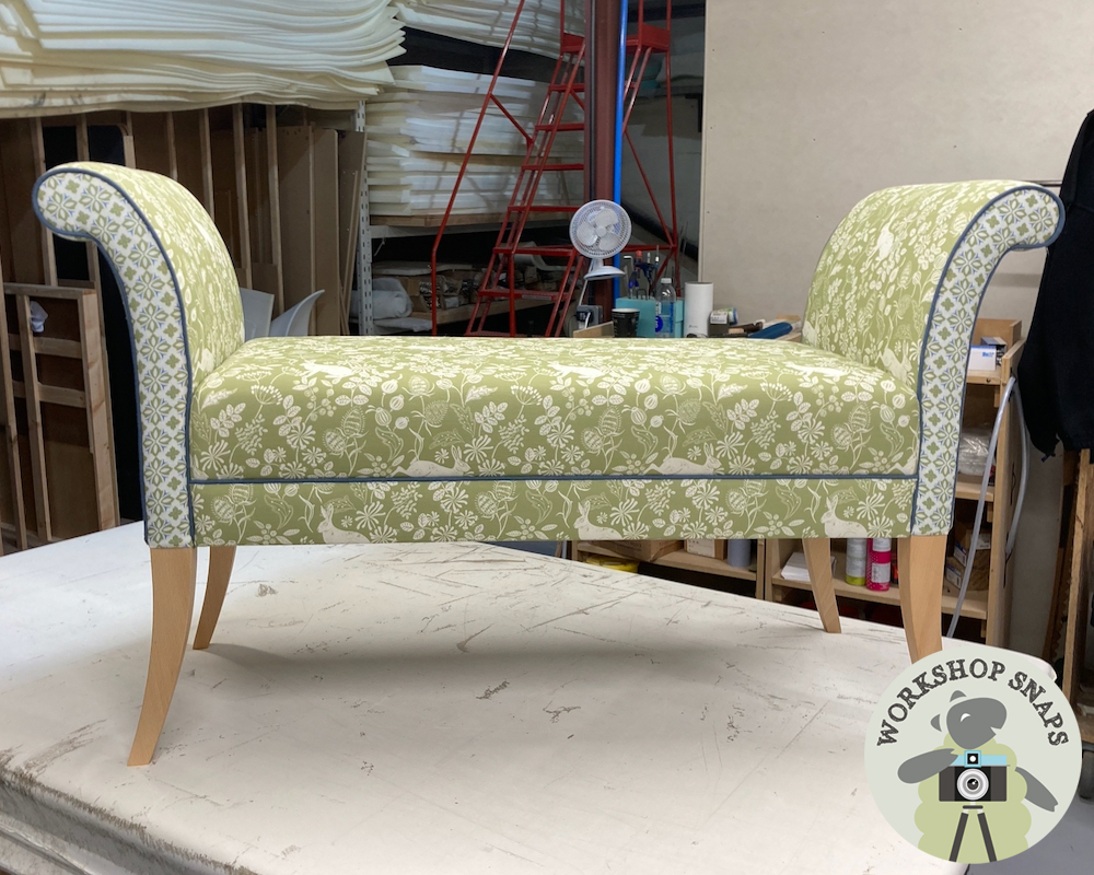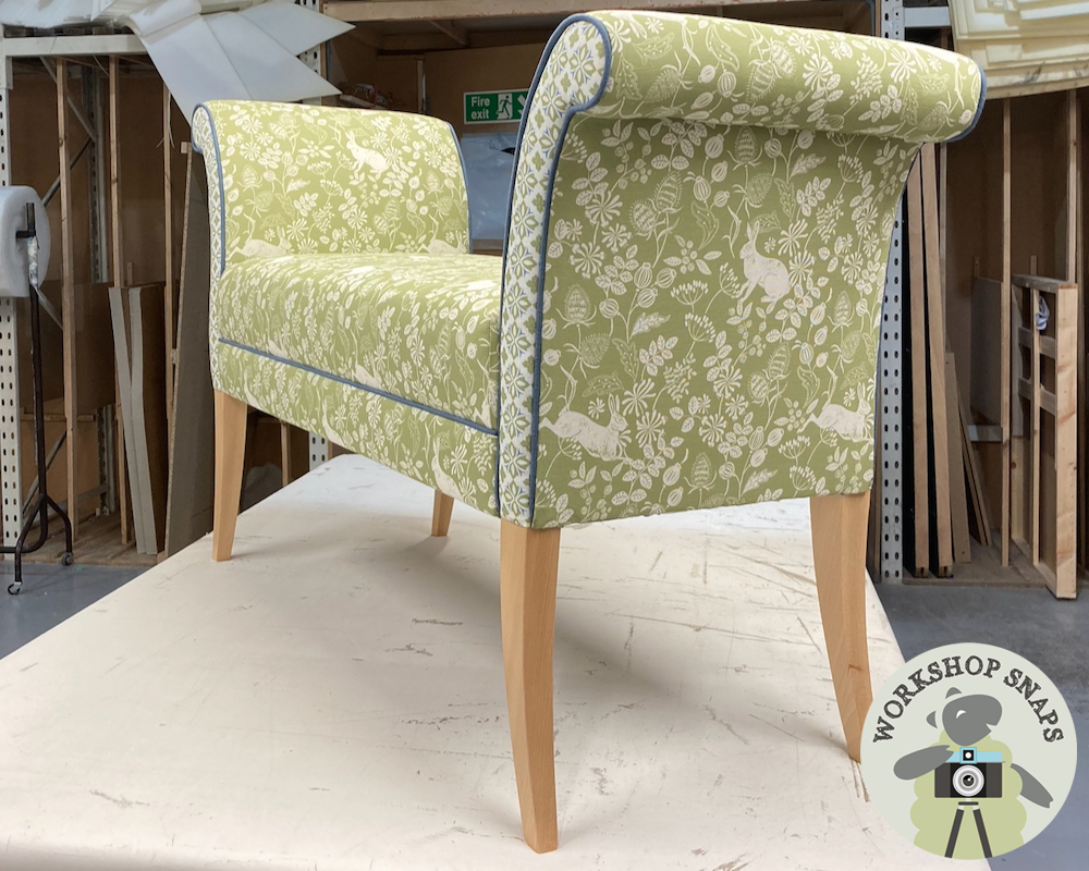Broxbourne Bench Stool - Customers Own Material - Stool in Meg Morton Bexington Hare Meadow - Facings in Meg Morton Alanna Meadow Green Beauminster - Contrast Piped in Romo Linara Lido - Light Leg - 10386
