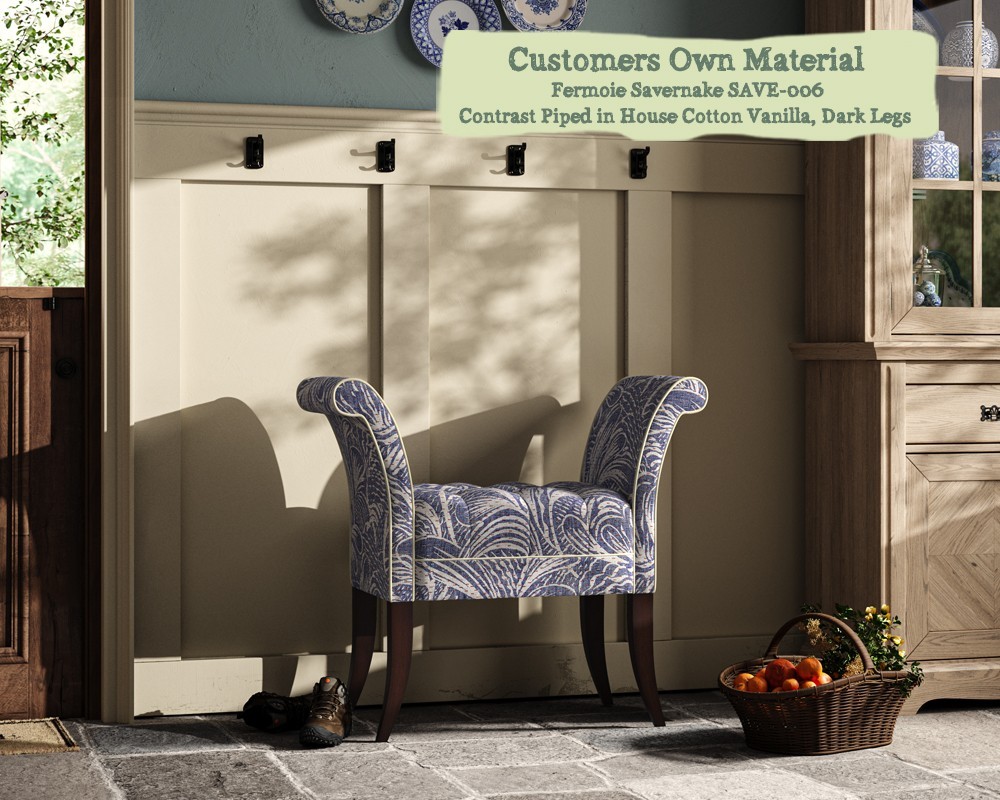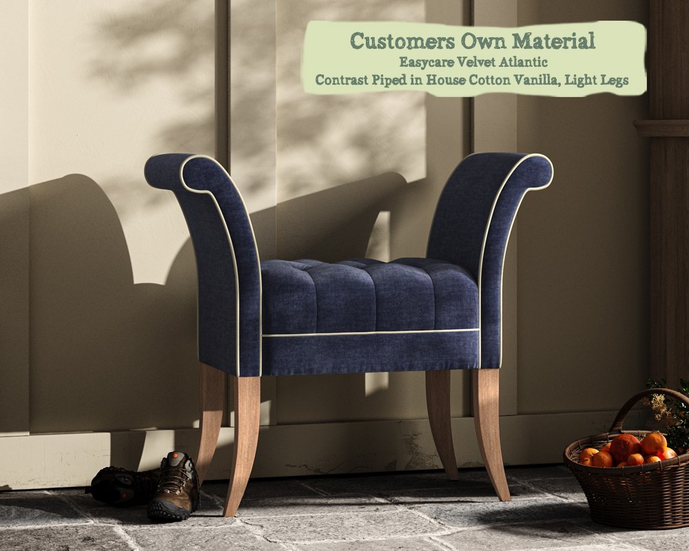 The Brignall Deep Buttoned Top Scroll Arm Bench Stool 88cm x 39cm (35 x 15") is handmade to order and fully customisable.