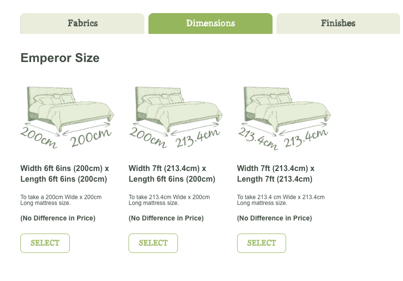 Emperor Beds are larger than kingsize and super king beds, measuring a whopping 7 feet by 7 feet (213 cm by 213 cm). Here at The Headboard Workshop, we also offer our Emperor Beds in a small emperor size at 6ft 6ins x 6 ft 6 ins (200 cm x 200 cm) and also in combinations of these measurements for a truly bespoke service This extra space ensures that you have plenty of room to roll over, toss, and turn without disturbing your sleep partner.