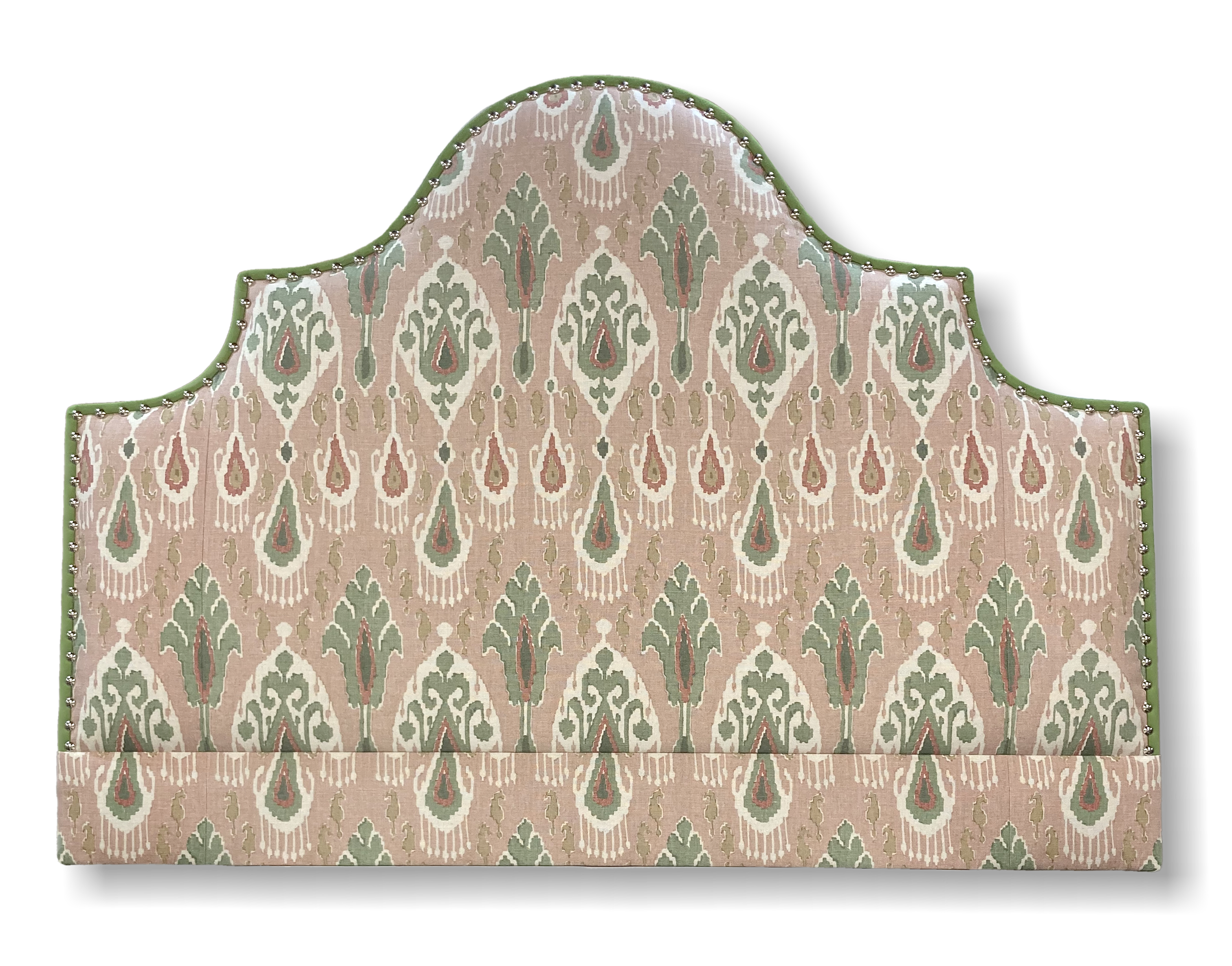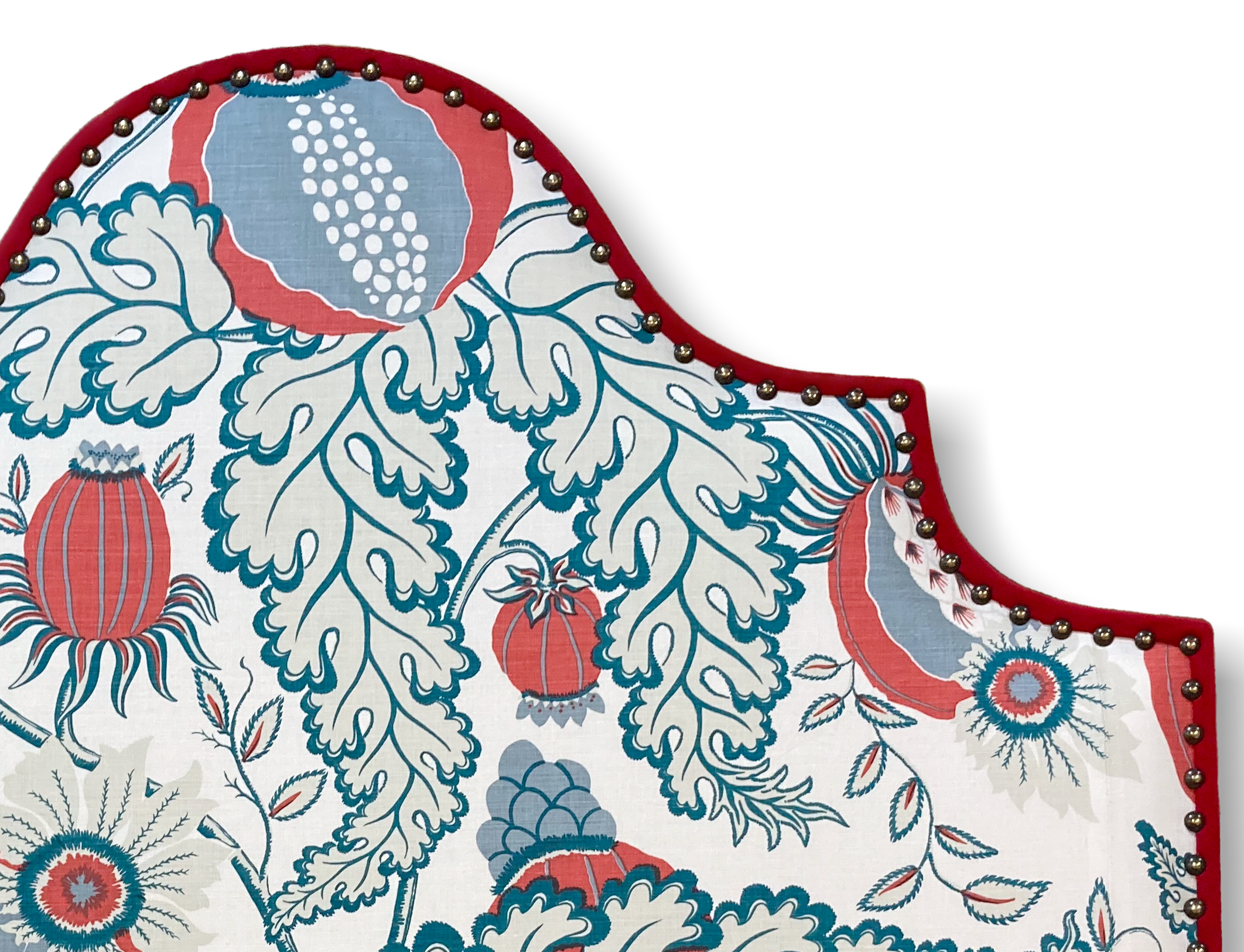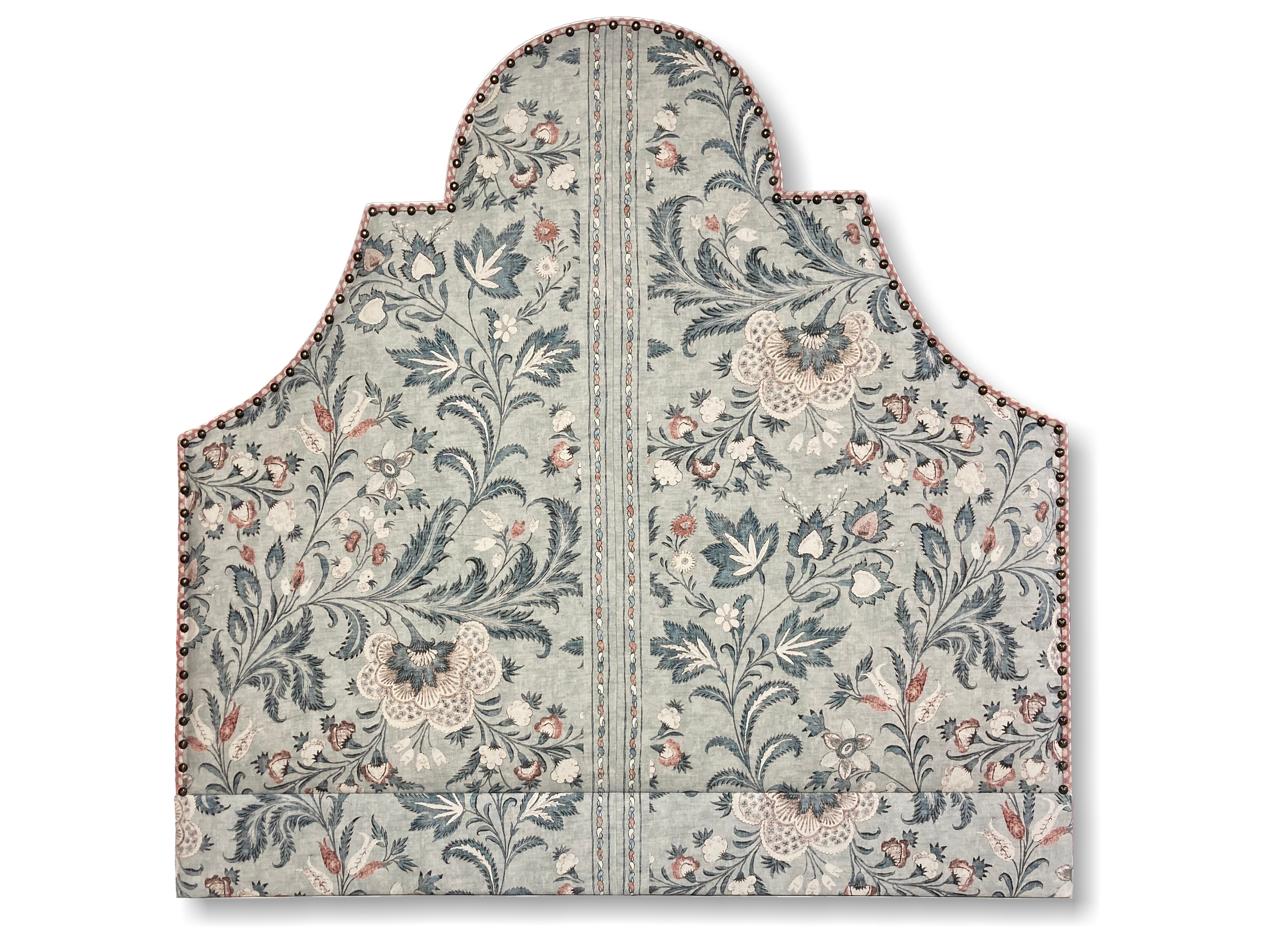 A border with return is a thin border around the outside of the shape of your headboard in a contrast fabric that wraps over to the front of the headboard and is finished with nails/studs for detail and to secure it in place.