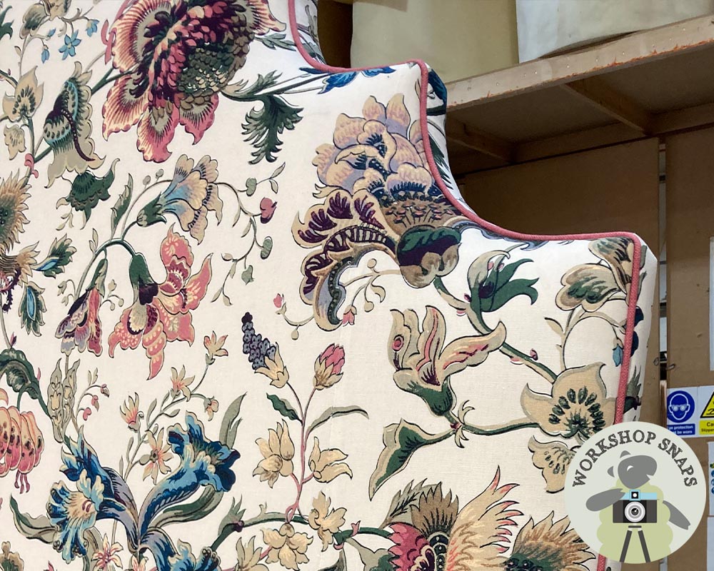Ornate Curved Shape Cardigan Headboard upholstered in Zinnias Linen Autumn Red Floral Fabric with Contrast Piping in Pure Cotton Rust in a Farrow and Ball Elephants Breath painted room