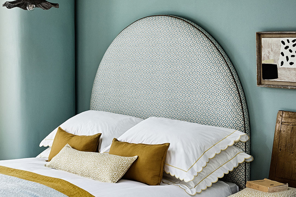 The Mousa headboard is simplistic, yet stylish in design; it’s half moon shape offers a plain canvas for beautiful and bold fabrics. Shown above in Rapture & Wright Majolica Voodoo (with matching Guernsey Bed Base), and finished with contrast piping in House Cotton Vanilla, this is a perfect example of how to show off a stunning fabric.