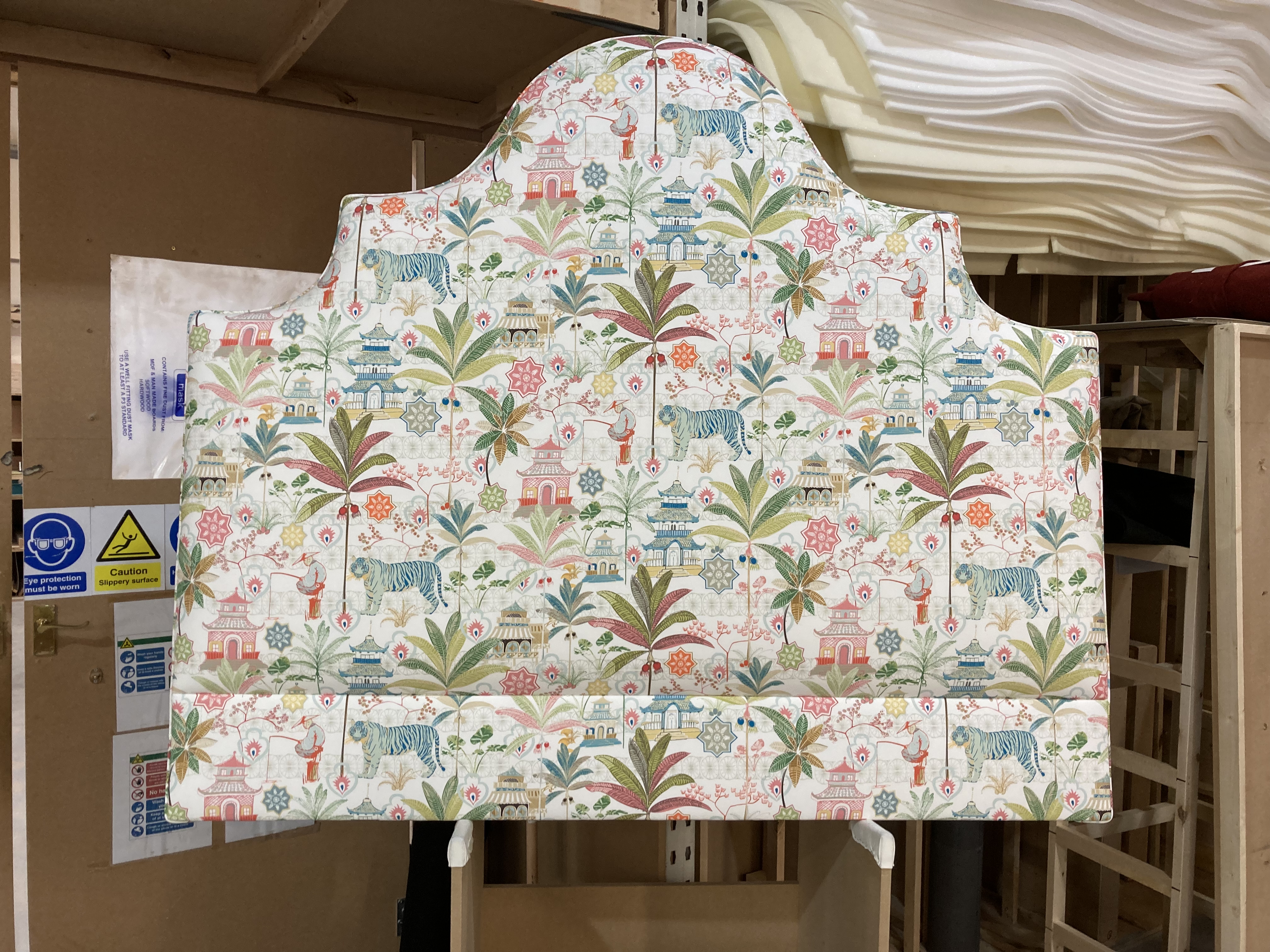 A classic example of a half drop pattern repeat – This main motif of a peacock is not central to the main drop of material and is repeated diagonally higher up the headboard.