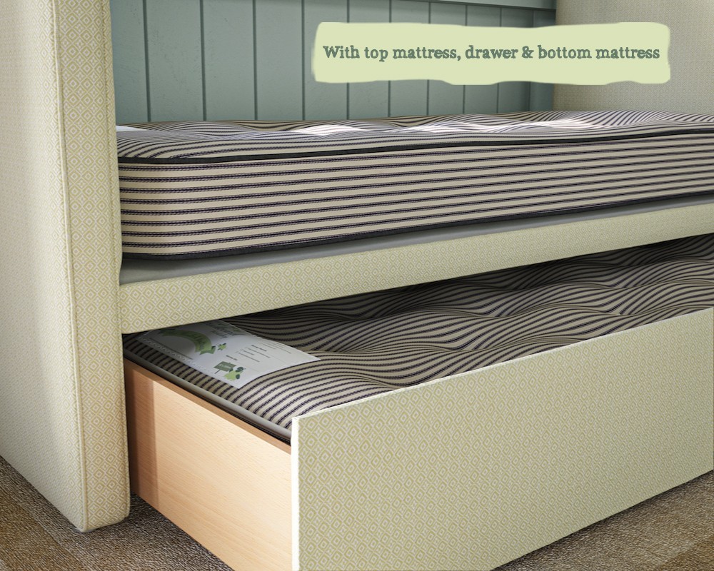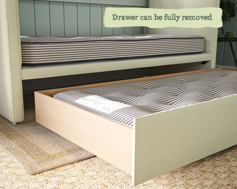 The underneath of the bed can be left empty for your own storage baskets and suitcases or you can choose to add a clever upholstered drawer which can even be filled with a full size mattress (with white edge piping), for use as a second bed. An empty drawer can provide useful extra storage whilst the large pull out wooden tray provides a useful surface for jigsaws, games, activities etc.