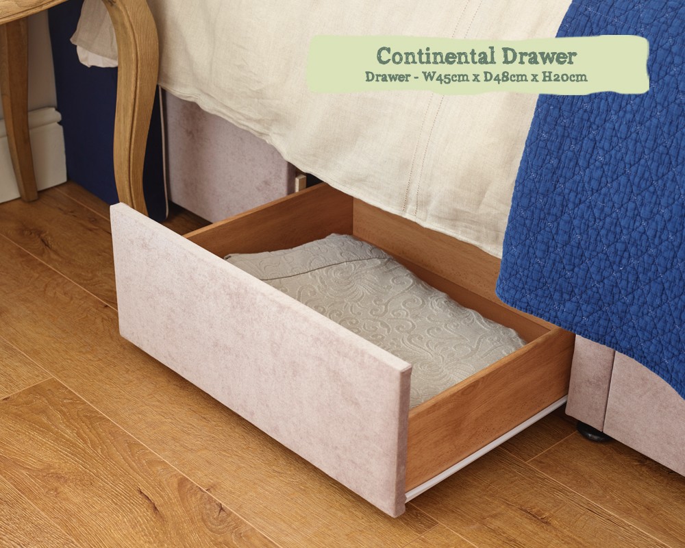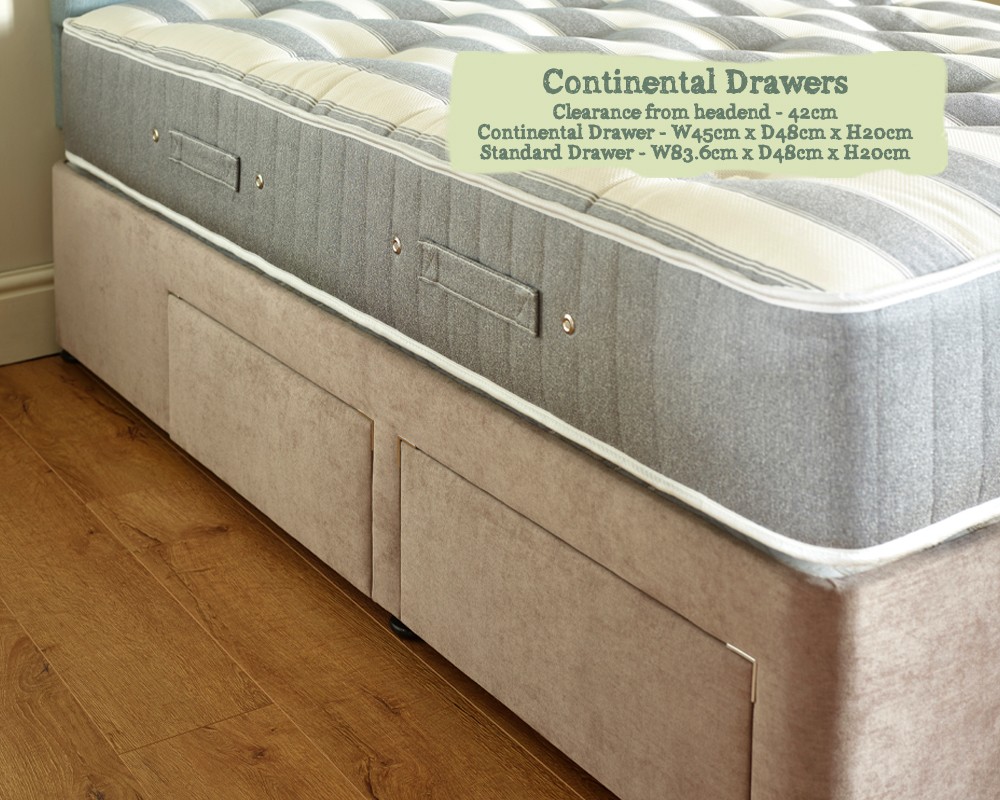 Opt for the continental drawers if you would like access with a bedside table or if you are ordering one of our winged headboards. Each side has one full sized drawer and one smaller drawer, which provides a clearance of 42cm from the headend.