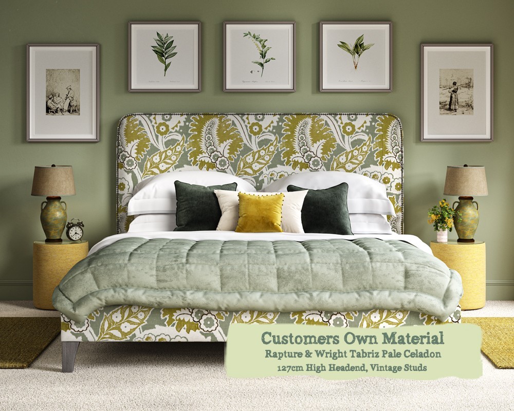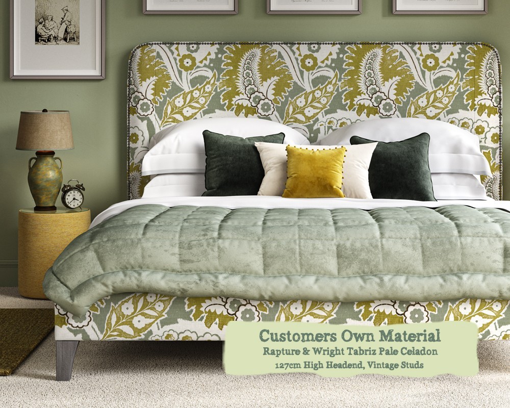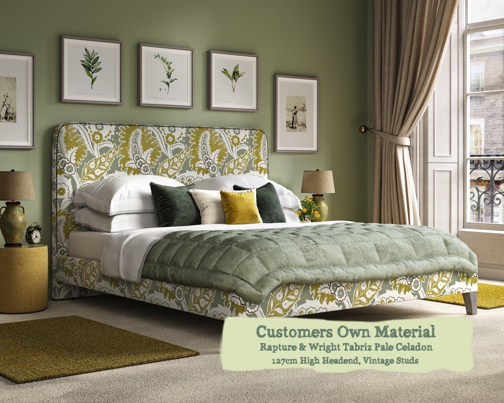 Double Faray Grand Bed Rapture & Wright Tabriz Pale Celadon 127cm Vintage Strip Studs 6ins Leg