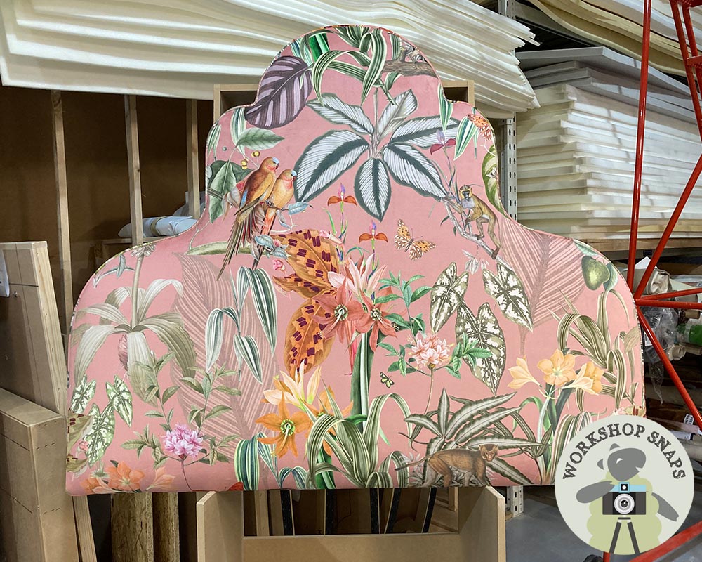 Double Eigg Headboard - Customers Own Material - Ian Sanderson Dulce Briar Rose - Contrast Piped in Linwood Chocolate - 240707