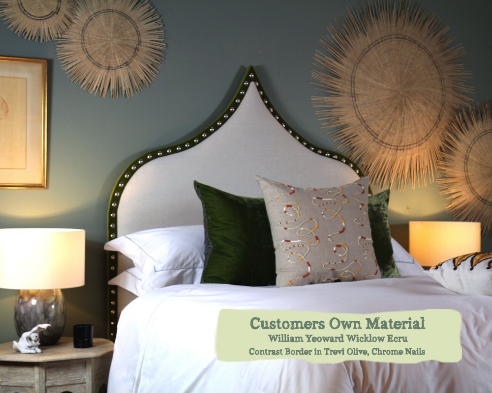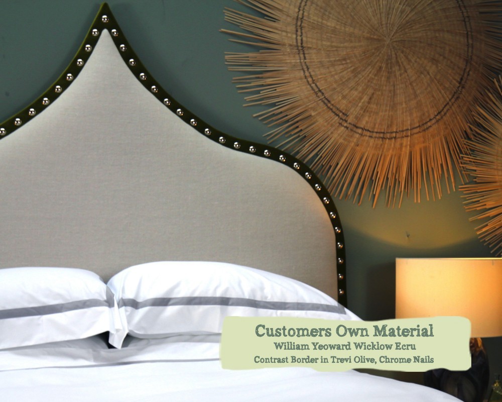 The Ewe is a floor standing headboard designed to show off a stunning fabric and is influenced by eastern interior trends. The sophisticated nailed border adds interest with metallic hues to match and compliment your choice of material.