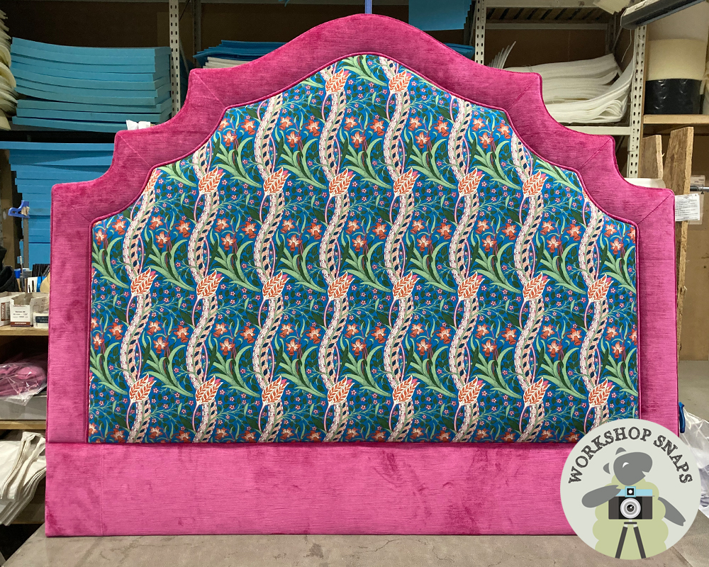 Bespoke Double Bardsey Headboard - Customers Own Material - William Morris Daffodil - Contrast Border in Andrew Martin Mossop Cerise - Flat Front - With Pillowstop - 225174