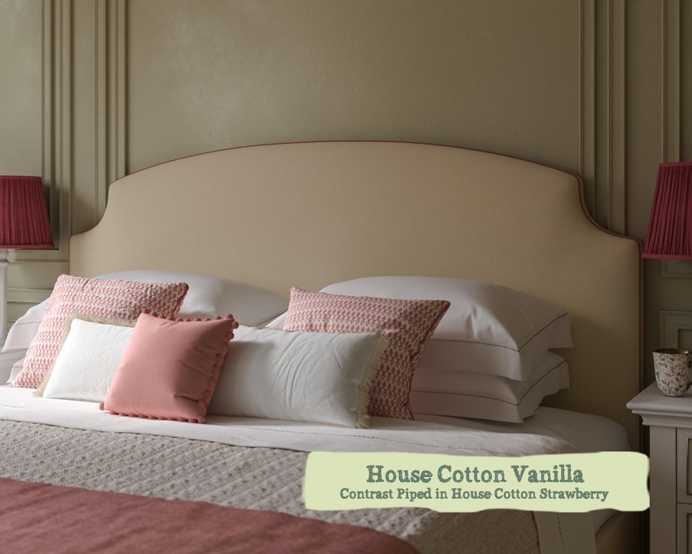 Puffin Headboard in Zoffany Suffolk Stripe Pale Olive - Contrast Piped in House Cotton Vanilla