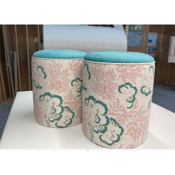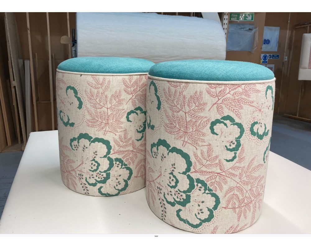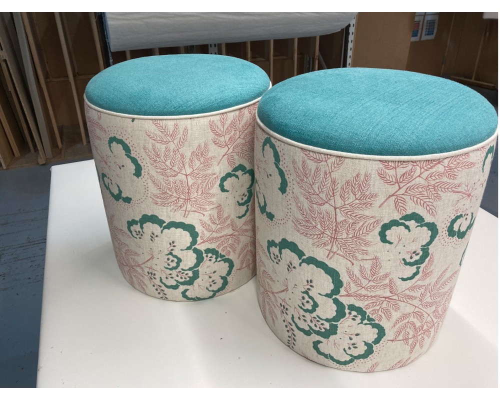 These round upholstered drum stools are ideal for use as versatile seating. Thiey are expertly upholstered in Rapture & Wright Cloud Garden Vert dis Gris with with a Soft Weave Lagoon top, complemented by contrast piping in the same ground colour as the Cloud Garden.