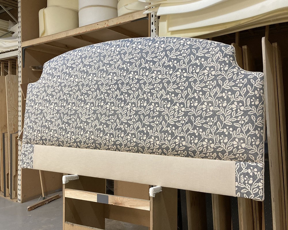 The Puffin Headboard provides a sweet curve with shoulder 'bites' profile, perfect for this soft and whimsical fabric.