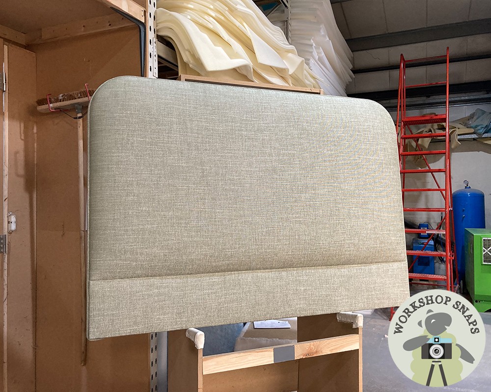 This ex display Double Faray Headboard is expertly upholstered in House Weave Sage, is self piped around the edge in the same fabric and includes a pillowstop.