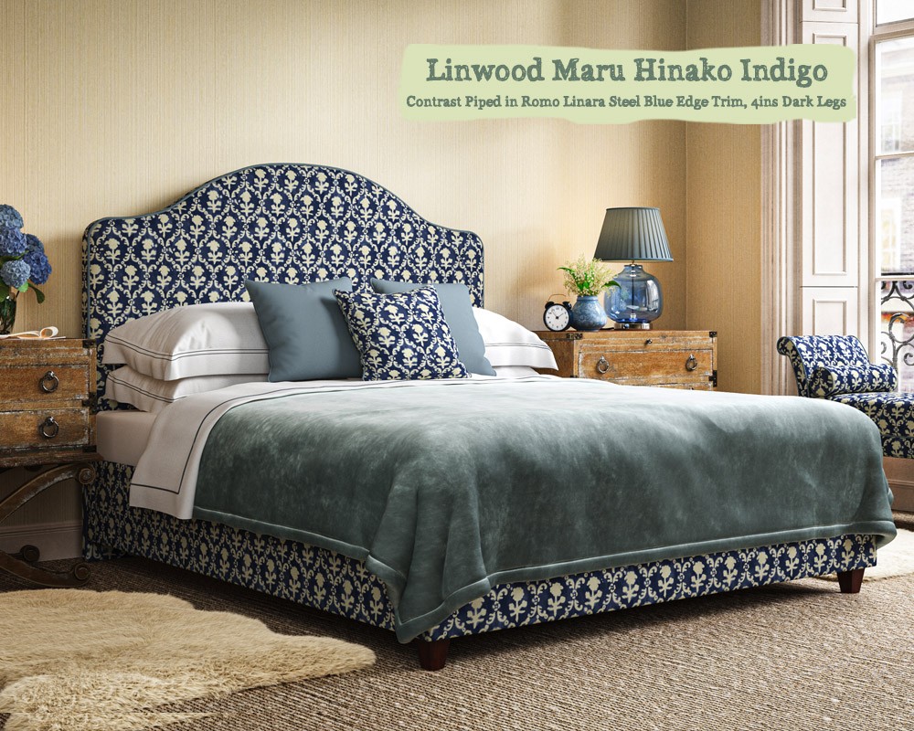 Barra Bed in Linwood Maru Hinako Indigo, Contrast Piped in Romo Linara Steel Blue
