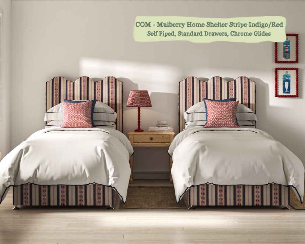 Solas Coll Bed shown in Mulberry Home Shelter Stripe Indigo/Red, Self Piped with Chrome Glides and Standard Drawers.