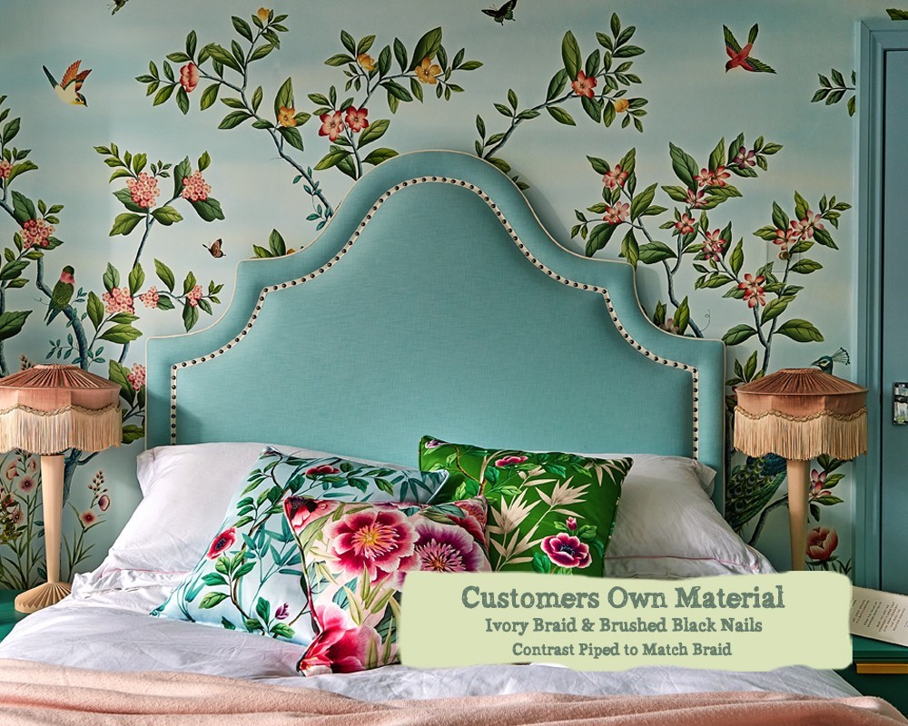 Kingsize Kerrera Headboard - Flat Velvet Mediterranean - Ivory Braid - Vintage Nail - Contrast Piped to Match Braid - With Pillowstop - 234292