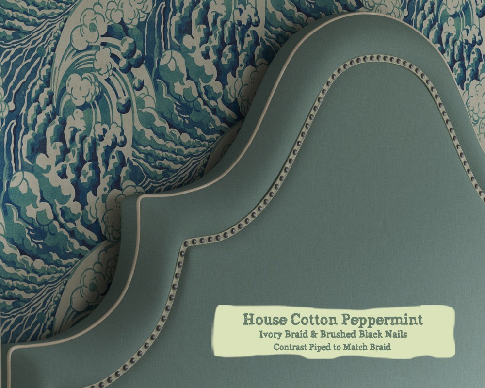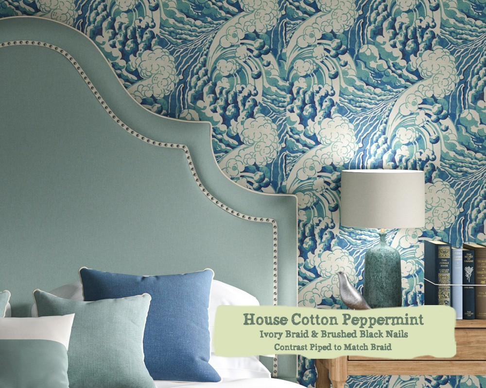 Kingsize Kerrera Headboard - House Cotton Peppermint - Ivory Braid - Brushed Black Nail - Contrast Piped to Match Braid - 244809