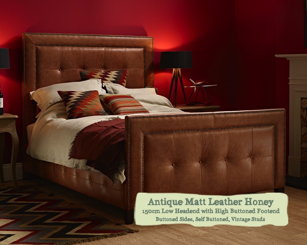 Single Bed Jura Antique Matt Leather Honey 150cm Low Headend Low Buttoned Footend Self Buttoned Vintage Studs