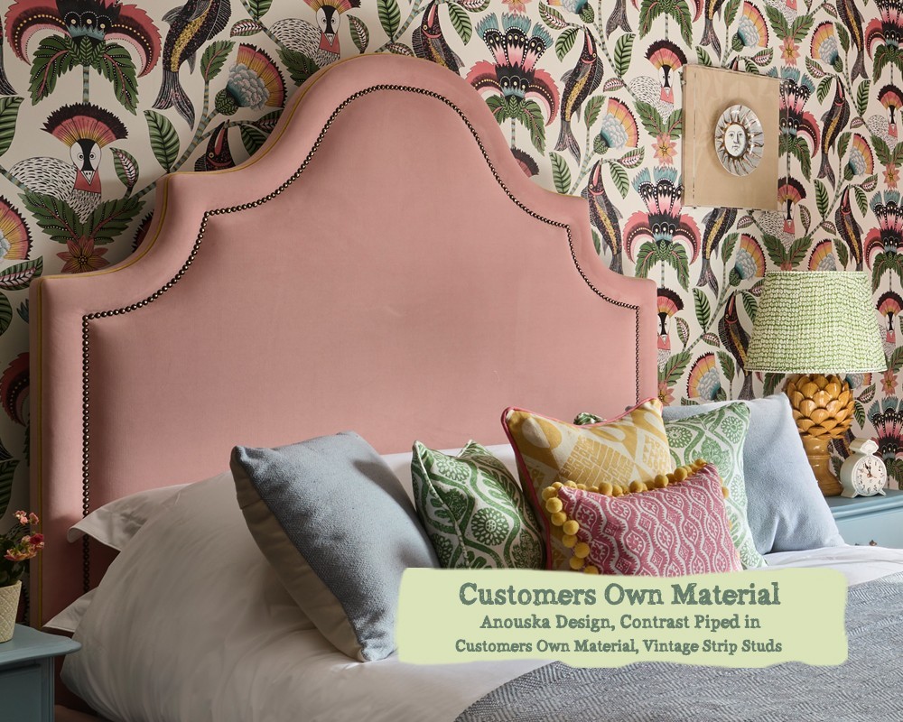 A fully upholstered bed with a curved and piped headend, featuring an inset nailed braid to mirror the grand profile.