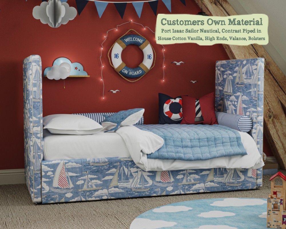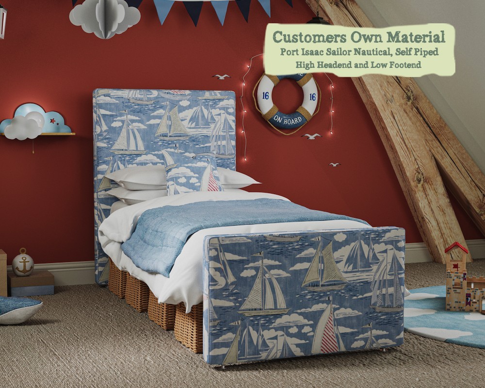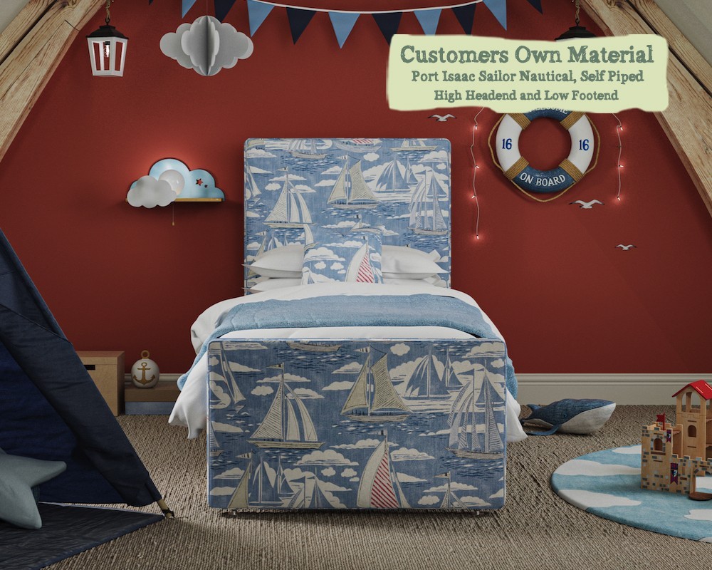 The headend and footend are available self piped, contrast piped in our House Cotton Vanilla or you can opt to contrast pipe in your own fabric. They are also available in 3 heights from the floor - 21.7ins (55cm), 35.8ins (91cm) or 50ins (127cm).