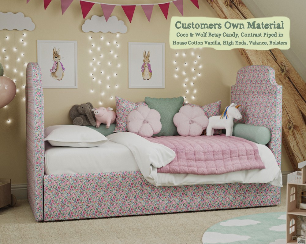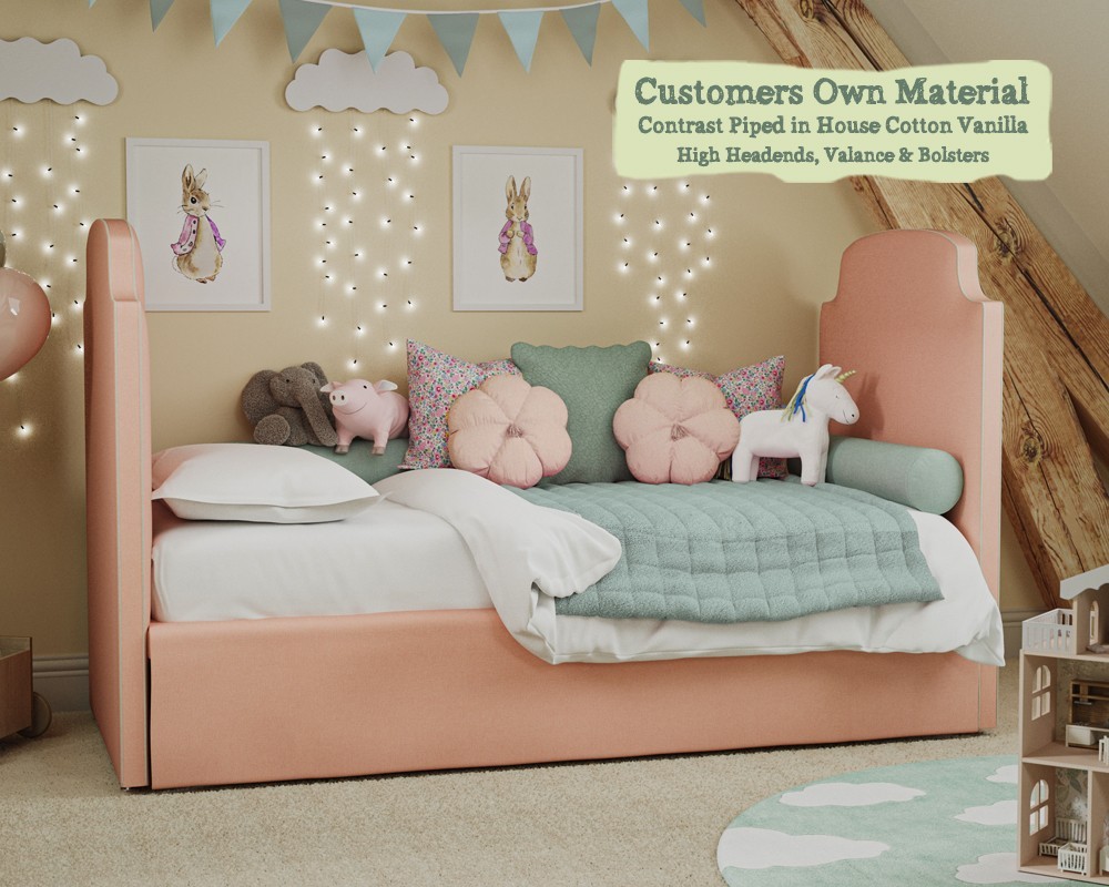 The headend and footend are available self piped, contrast piped in our House Cotton Vanilla or you can opt to contrast pipe in your own fabric. They are also available in 2 heights from the floor - 30ins (76cm) or 50ins (127cm).