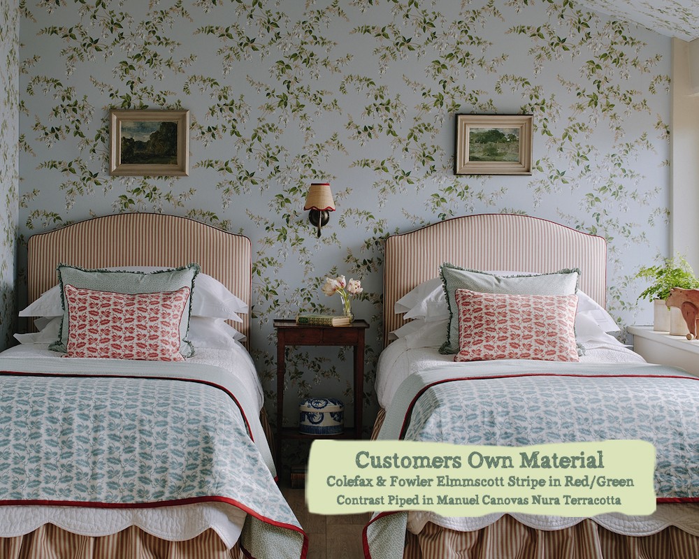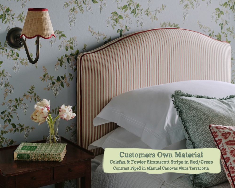 Headboard available Contrast Piped in House Cotton Vanilla. Offered with either Light or Dark, Tapered or Turned Feet at footboard. This bed has a solid mattress support platform.