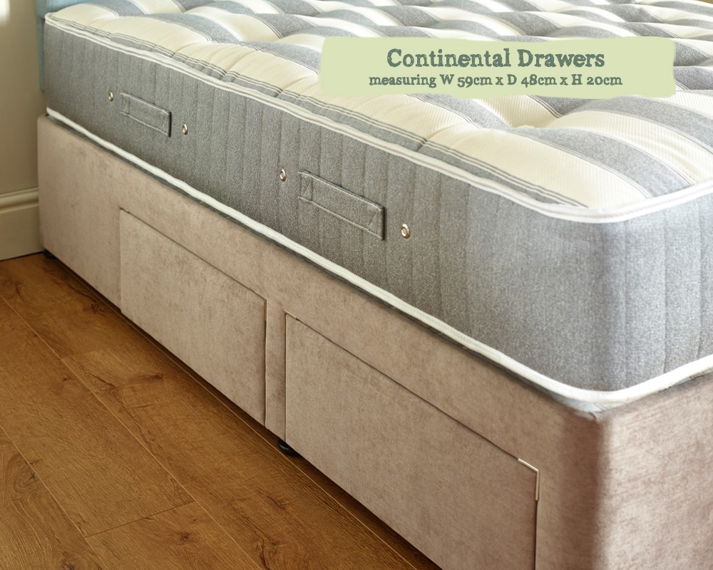 Opt for the continental drawers if you would like access with a bedside table or if you are ordering one of our winged headboards. The continental drawers provide a clearance of 46cm from the headend.