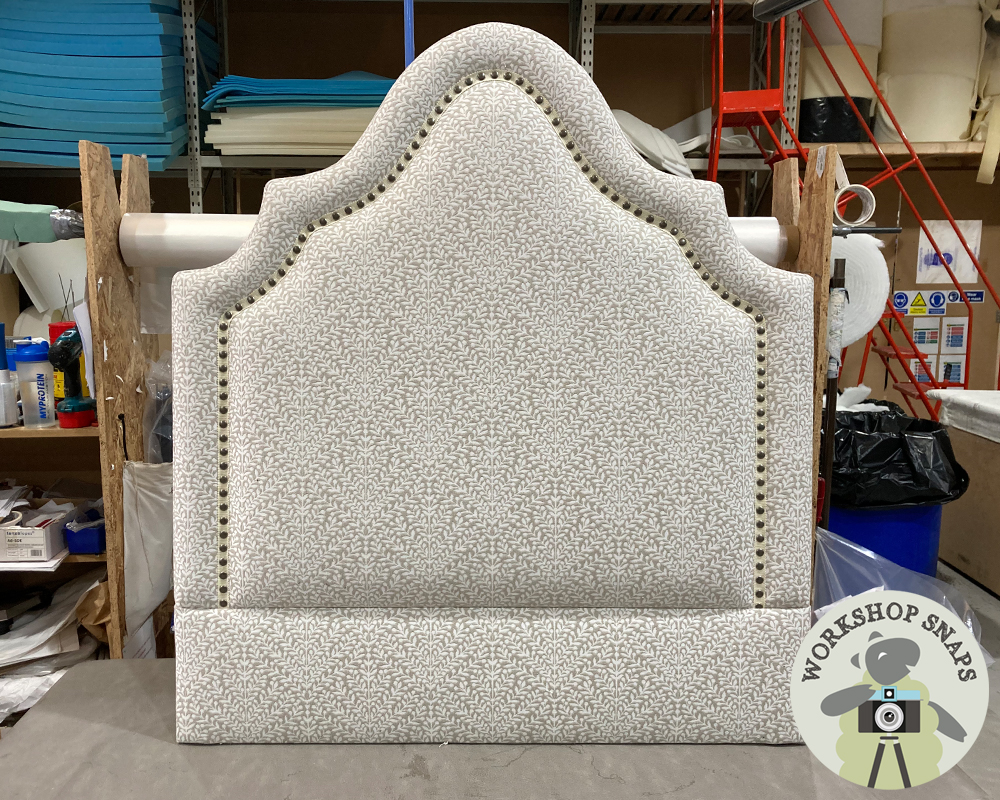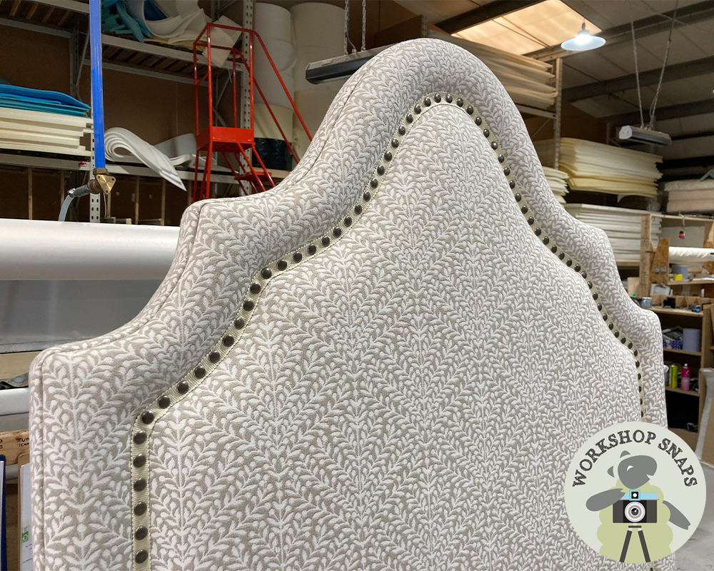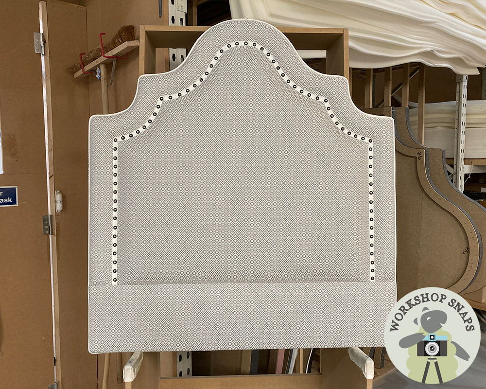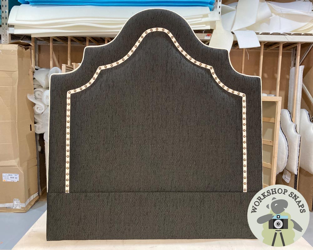 A curved and piped headboard with an inset nail detail to mirror the grand profile.