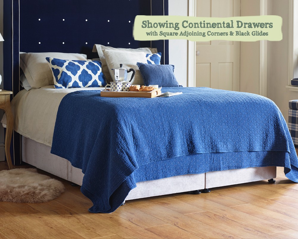 Opt for the continental drawers if you would like access with a bedside table or if you are ordering one of our winged headboards. Each side has one full sized drawer and one smaller drawer, which provides a clearance of 42cm from the headend.
