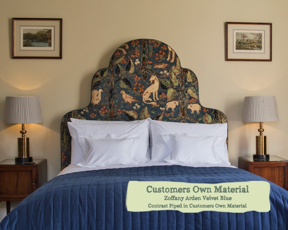 Small Double Bed Eigg Zoffany Arden Velvet Blue Contrast Piped and bed Base Customers Own Material