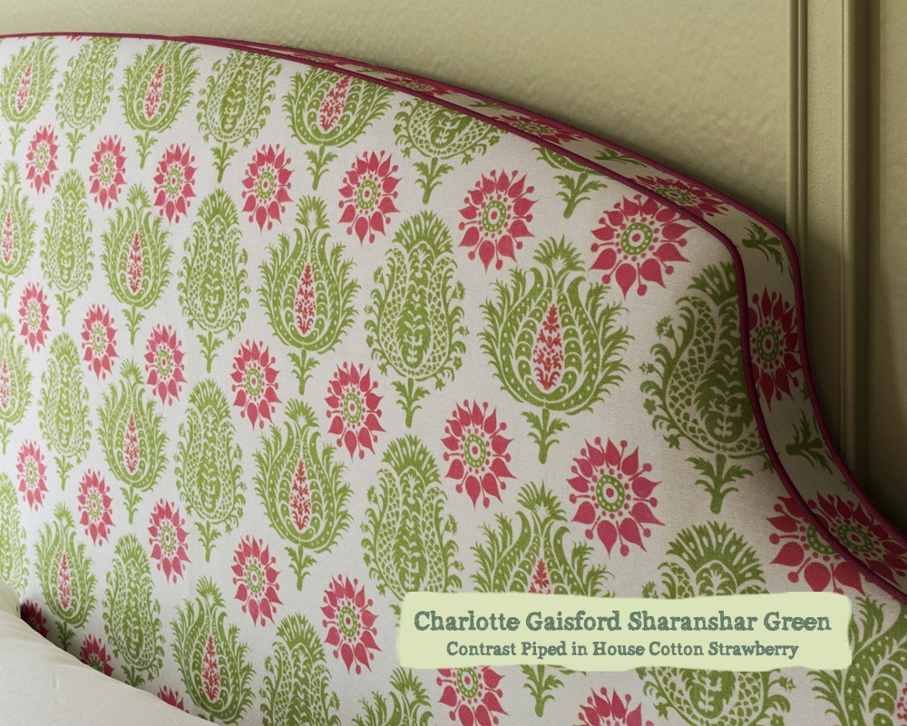 Super King Puffin Bed in Charlotte Gaisford Sharanshar Green Contrast Piped in HC Strawberry