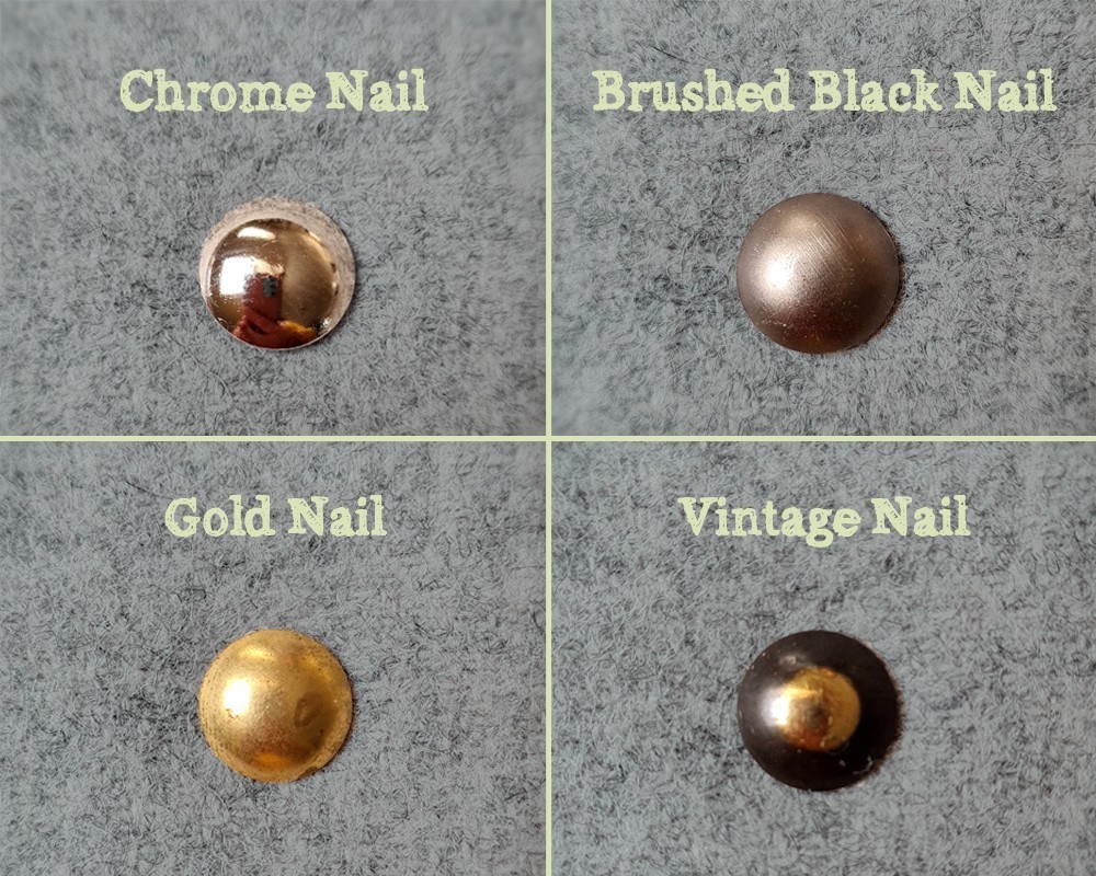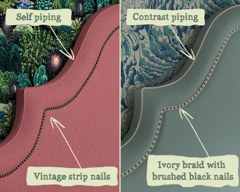 The headend's inset 15mm braid is available in Ivory with either Chrome, Brushed Black, Gold or Vintage 11mm nails. Alternatively you can opt for strip studs inset detail. Please scroll to the end of the gallery for example images.