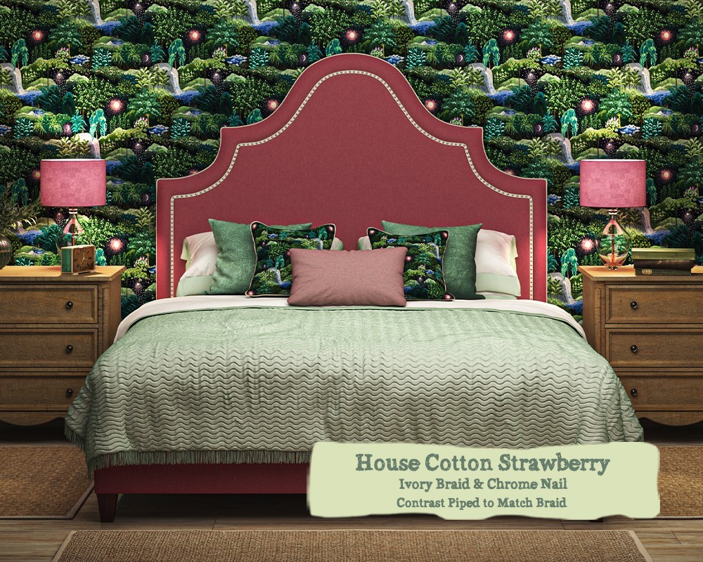 A fully upholstered bed with a curved and piped headend, featuring an inset nailed braid to mirror the grand profile.