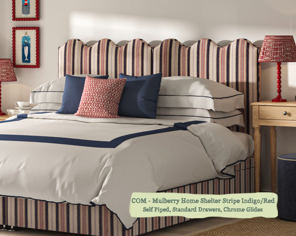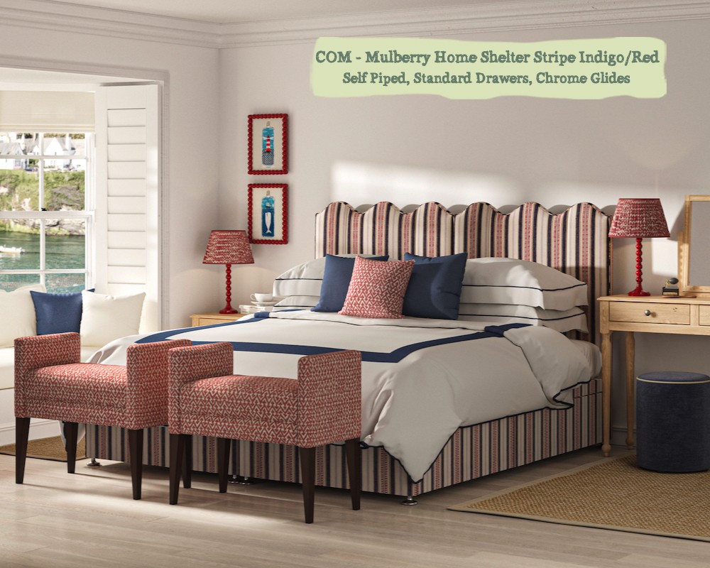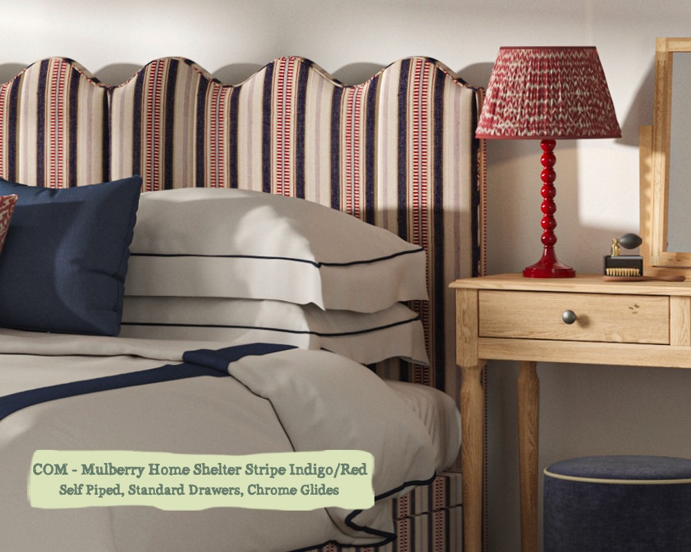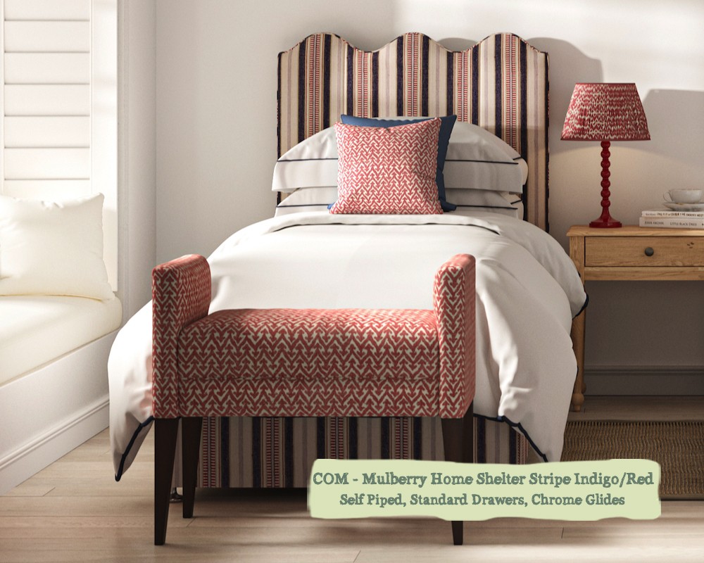 Solas Coll Bed shown in Mulberry Home Shelter Stripe Indigo/Red, Self Piped with Chrome Glides and Standard Drawers.