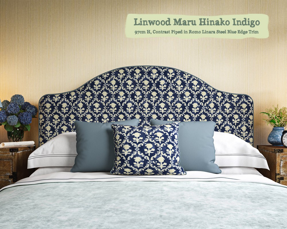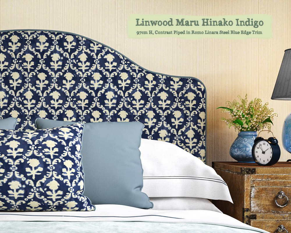 Barra Headboard in Linwood Maru Hinako Indigo, 97cm High, Contrast Piped in Romo Linara Steel Blue
