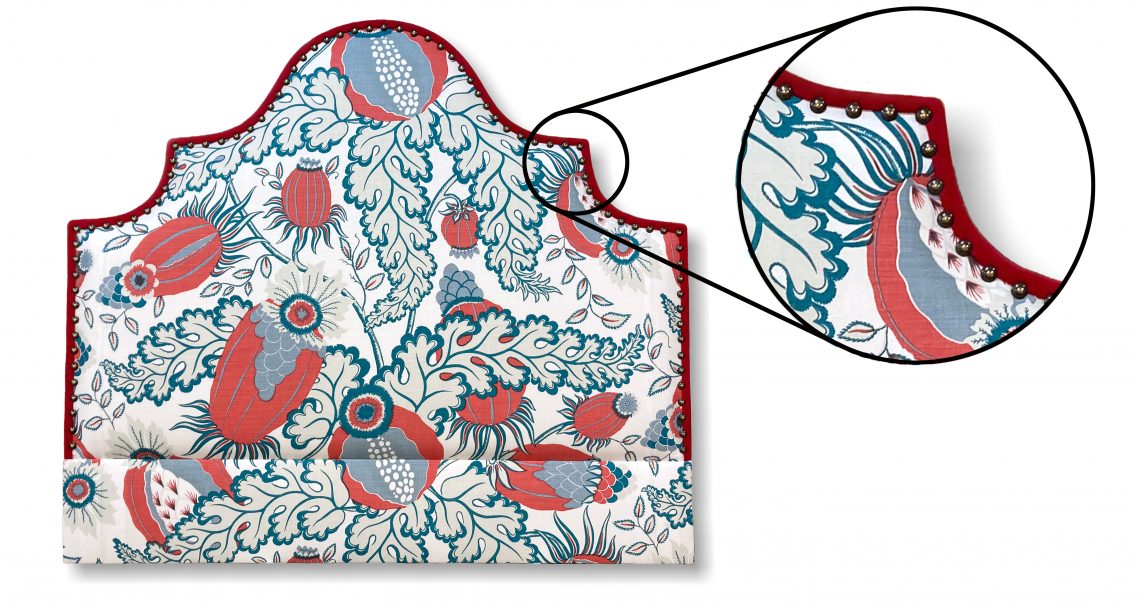 A border with return is a thin border around the outside of the shape of your headboard in a contrast fabric that wraps over to the front of the headboard and is finished with nails/studs for detail and to secure it in place.
