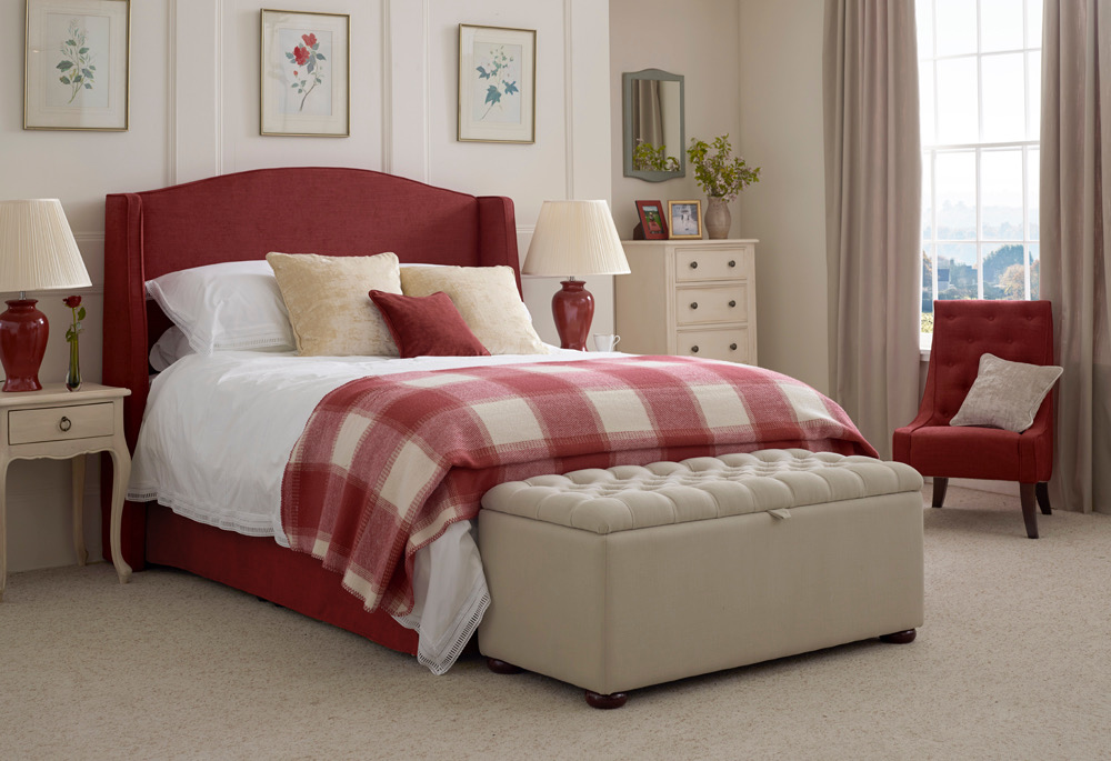 Enjoy an enclosed sense of security with a winged headboard. We love this winged headboard with its gentle arch for a number of reasons. Firstly, it’s beautiful. Secondly, it boasts perfect proportions and looks extremely tactile when upholstered in a rich coloured linen. Add a checked wool blanket for a cosy accessory.