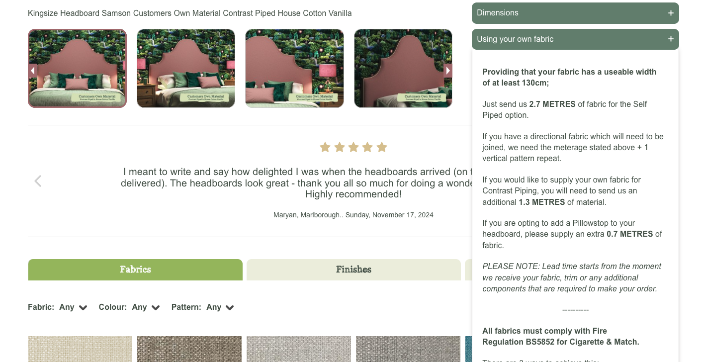 At The Headboard Workshop, we accept Customer’s Own Fabric (COM) for upholstering onto a headboard.